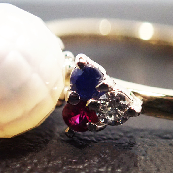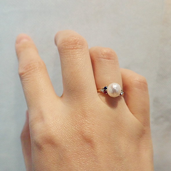 華真珠の放つ柔らかな光に、質の良い宝石を3粒合わせました。シンプルながら存在感のあるデザインは、指を美しく見せてくれます。