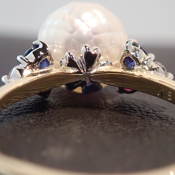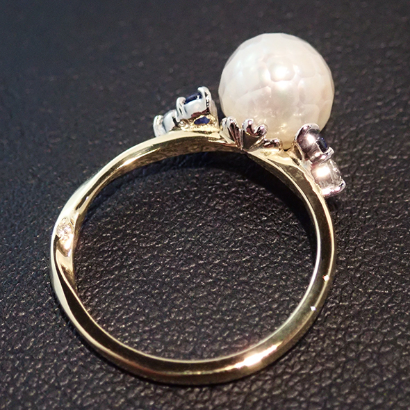 さらに金色の腕には、ねじりを加えて小さなダイヤモンドを留めました。華真珠の留まっている台座は、可愛らしい桜型です。
