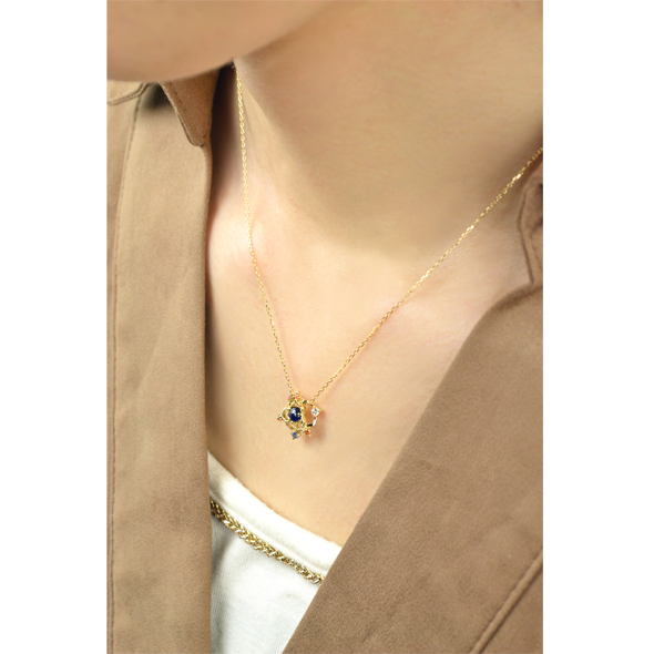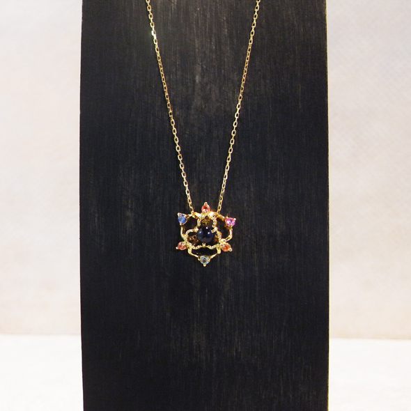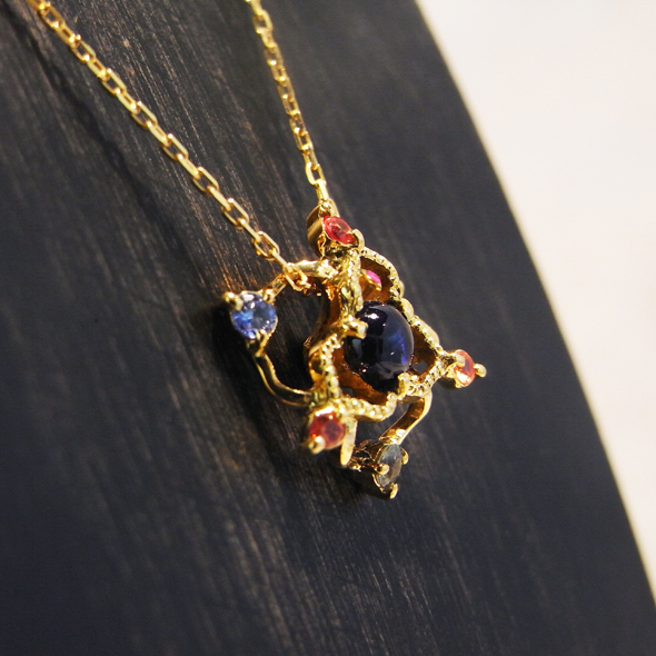 「百花(ももか)」からネックレスの新作です。18金イエローゴールドとカラーサファイアで、カボションカットのブルーサファイアを包みました。