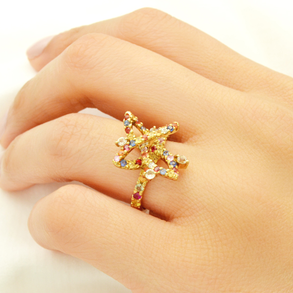 「百花(ももか)」から指輪のご紹介です。「波の花」は、波の白いしぶきや泡を花にたとえて使う古語です。カラーサファイアのラインがうねる波のようなので、この名前を名付けました。アクセントのダイヤモンドが、飛び散る泡のように、華やかさを添えています。イエローゴールドバージョンは、月が輝く波しぶきのようです。