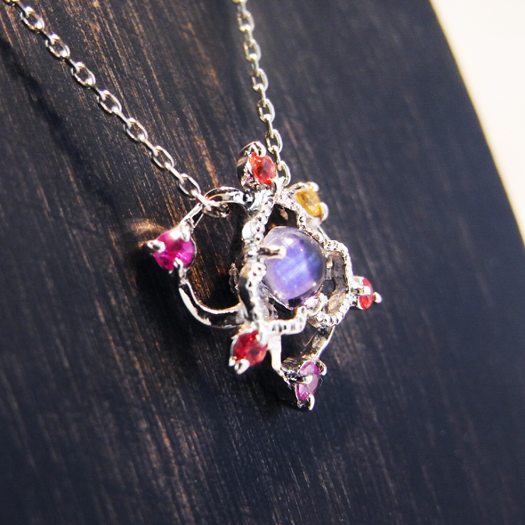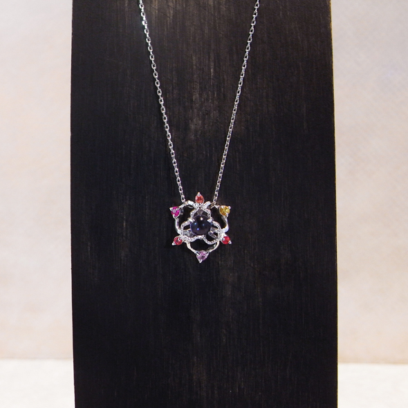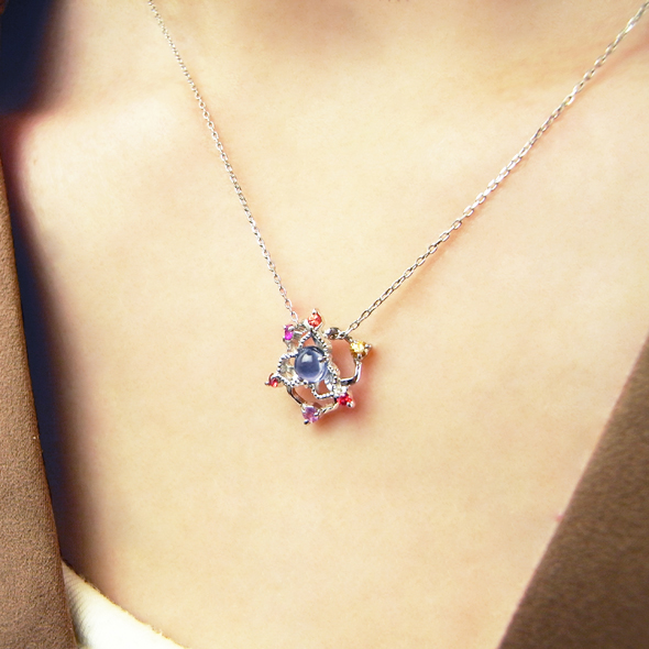 プラチナとカラーサファイアで、小さな花を作りました。中心の宝石はアイオライトという石で、スミレのような可憐な青色が特徴です。あえて花びらの形を不揃いにする事で、花達の生命力を表現しました。小さくても存在感のある花が、デコルテを上品に彩ってくれます。