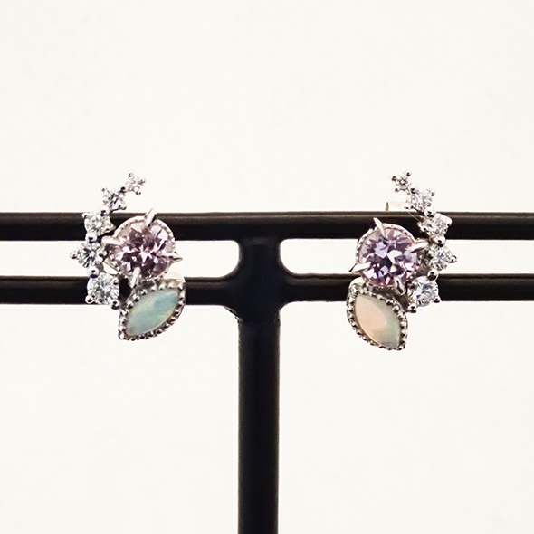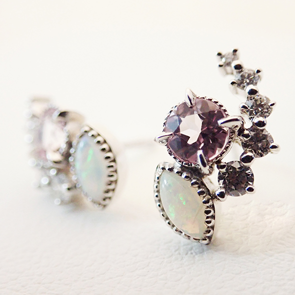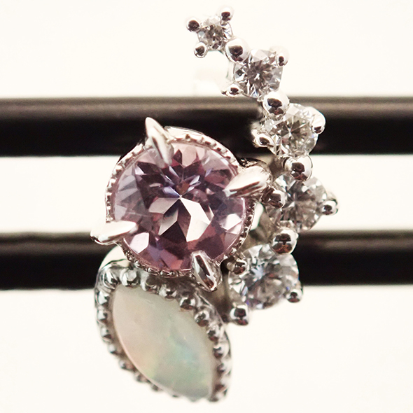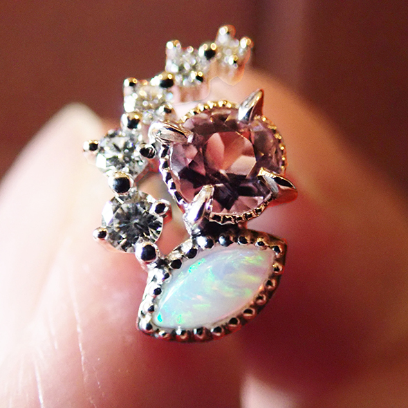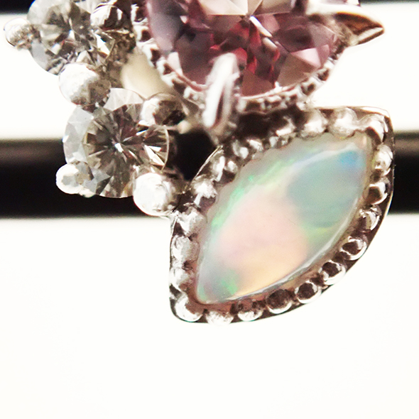 淡いピンクトパーズに七色のオパールが揺らめき、ダイヤモンドが光を添えています。それはまるで淡い花々を集めたブーケのよう。