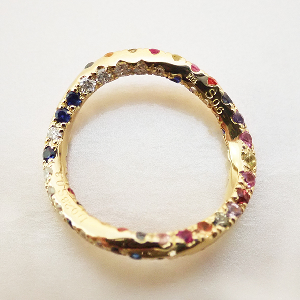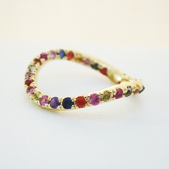 メビウスの輪のように、カラーサファイアとダイヤモンドが螺旋を織りなすフルエタニティリングです。