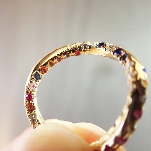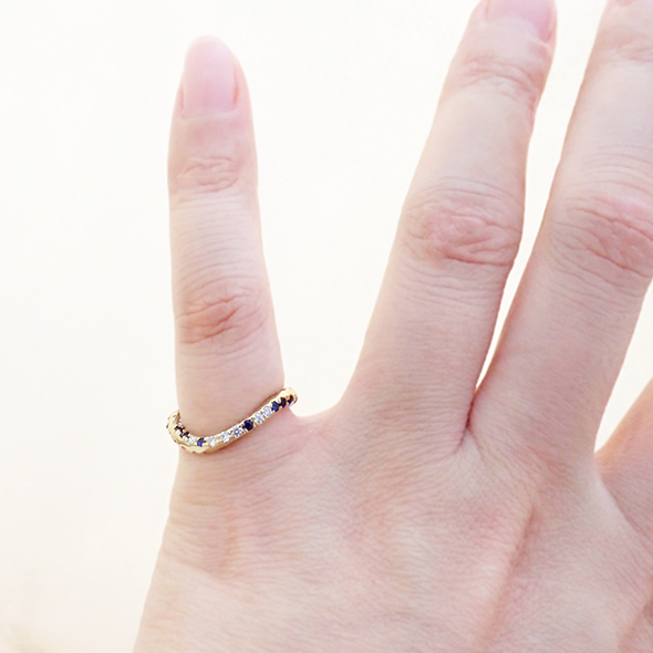 指輪の角度を変える事で、カラーサファイアのラインとダイヤモンドのラインが交互に楽しめます。