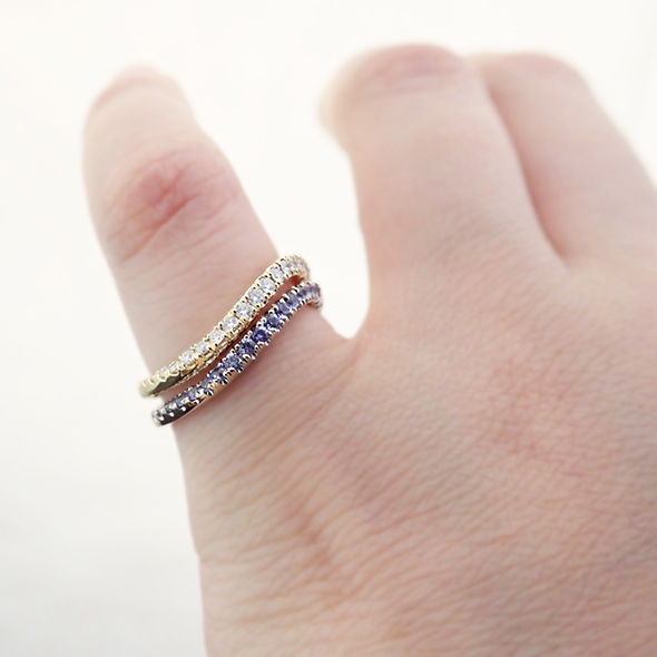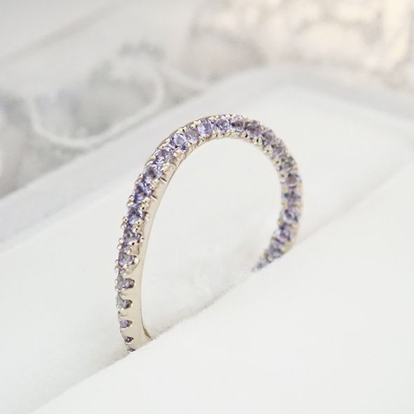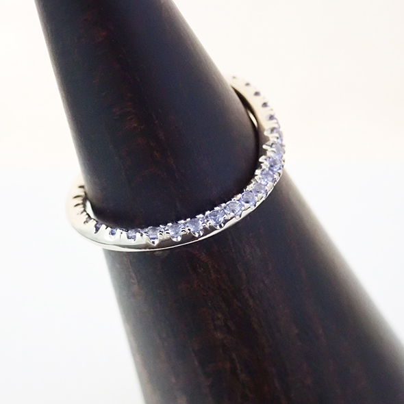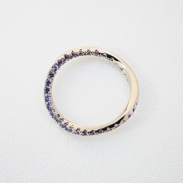 シャンパンゴールドに、タンザナイトを螺旋状に配置したフルエタニティリングです。