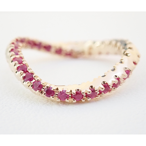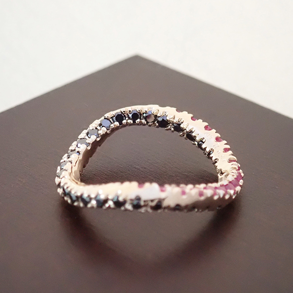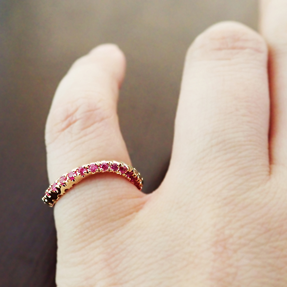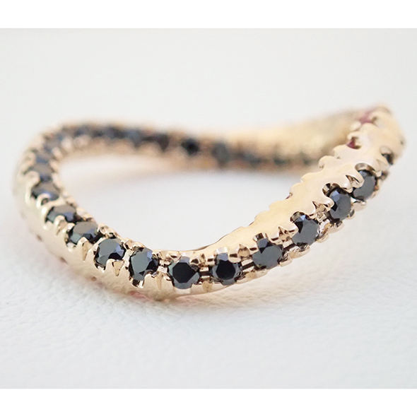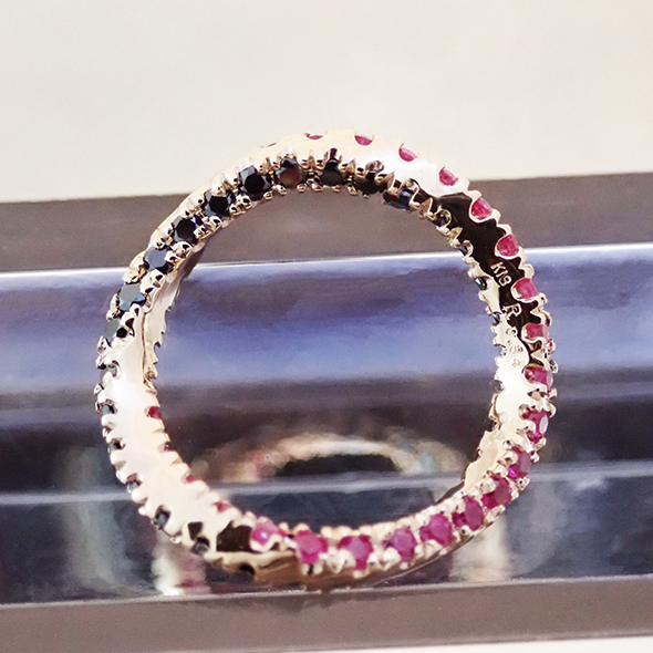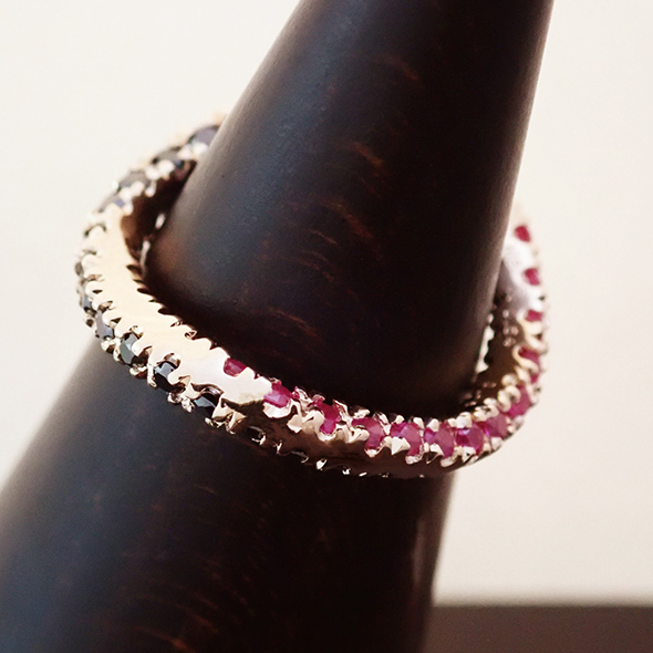 ピンクゴールドに、ルビーとブラックダイヤモンドを配置したフルエタニティリングです。