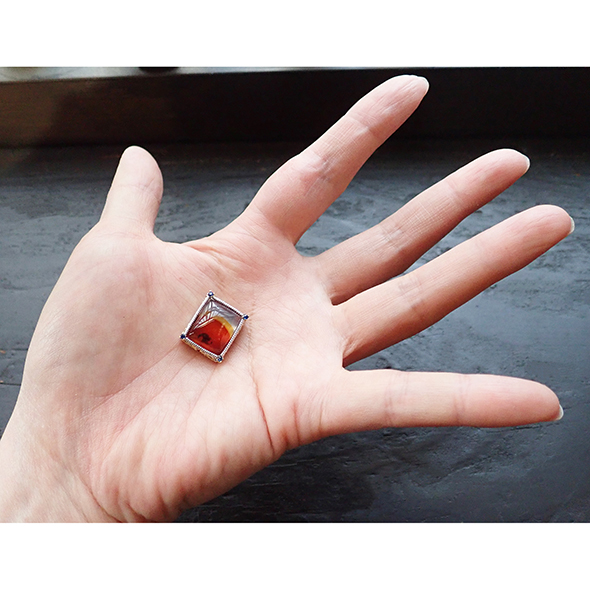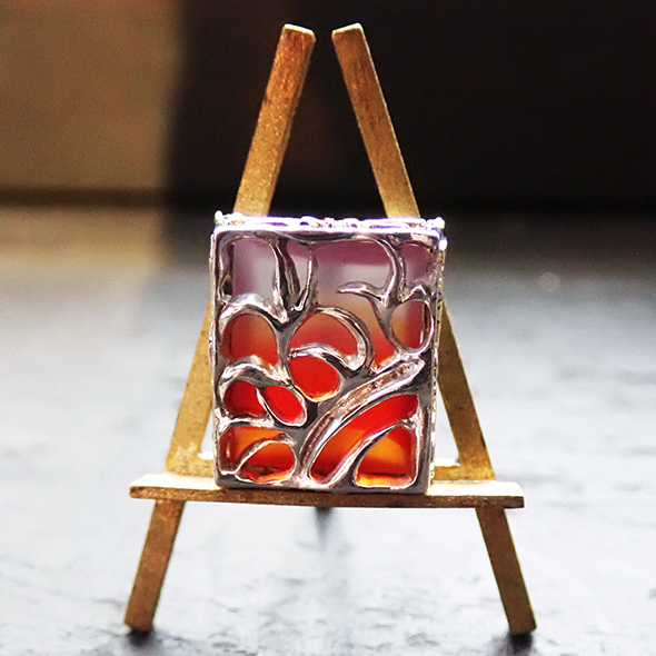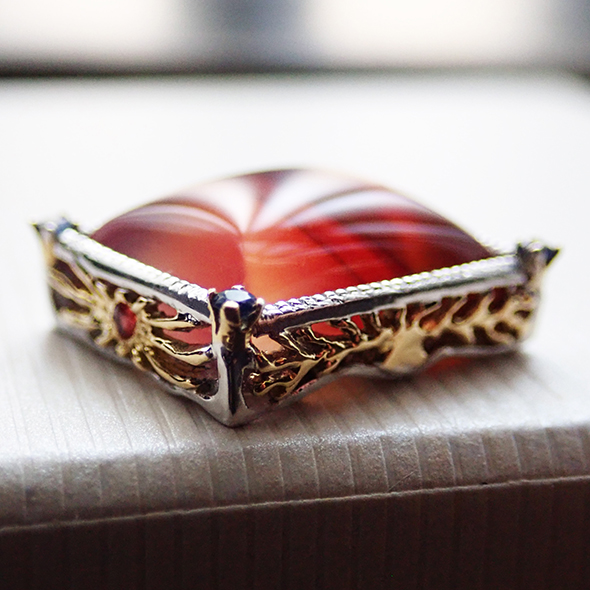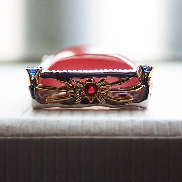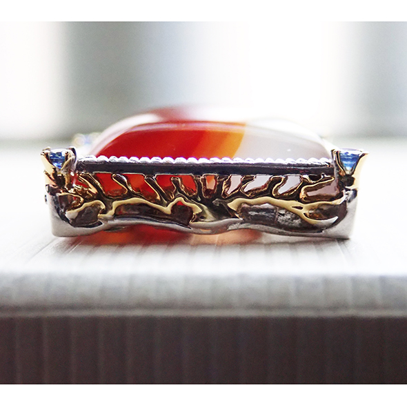 石座の側面にも、アフリカっぽく、ギラギラとした太陽と大木のモチーフを金とオレンジサファイアで表現しました。