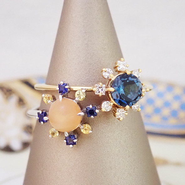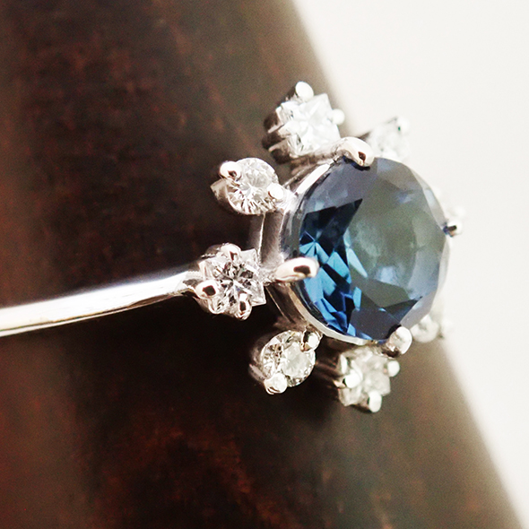 小さな四角と丸のダイヤモンドが、中心の石を引き立ててくれます。