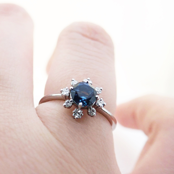 ブルートパーズとダイヤモンドがさりげなく輝く上品な指輪です。