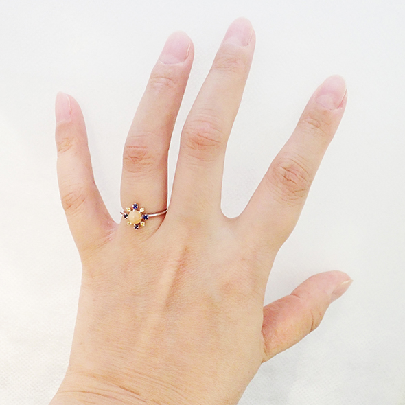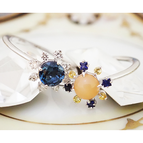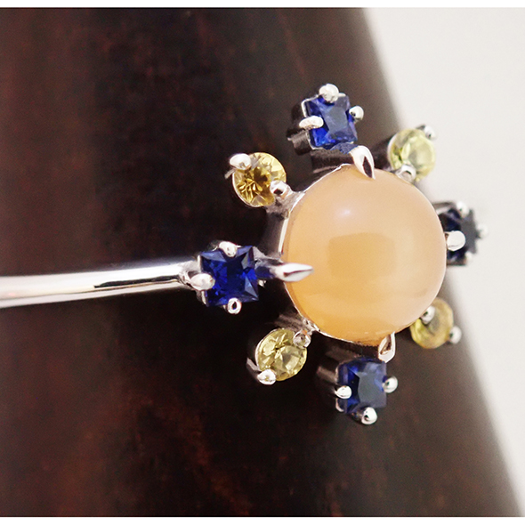 黄色と青のサファイアが、カボションの周りを華やかに彩ります。
