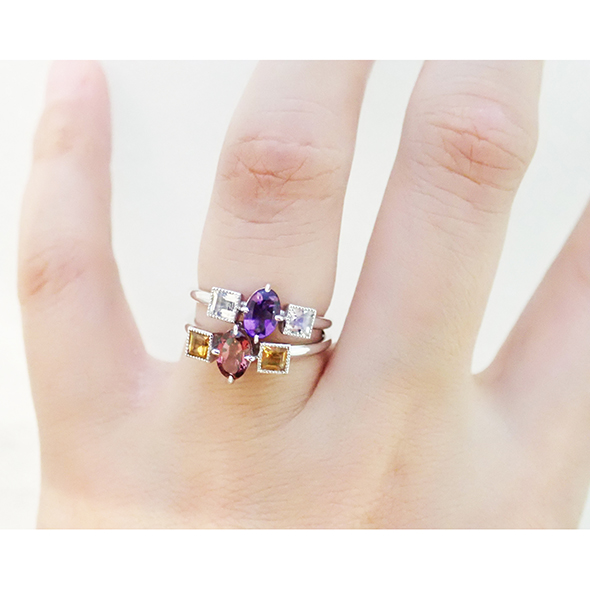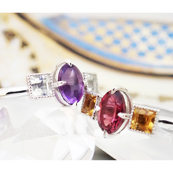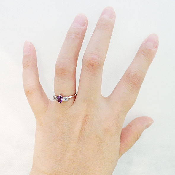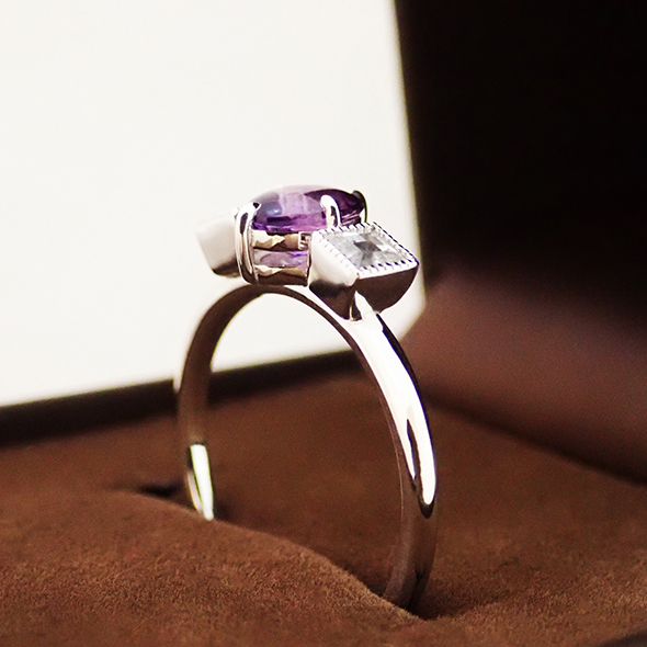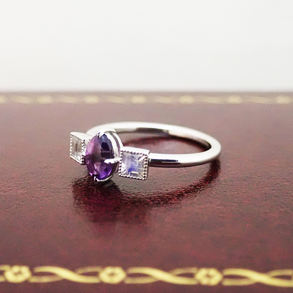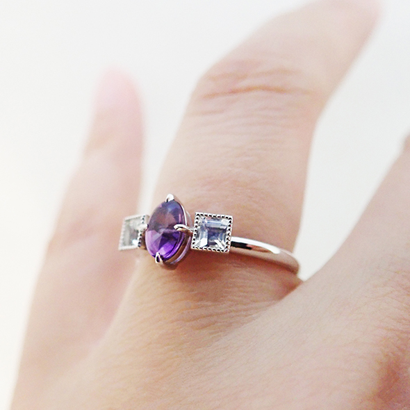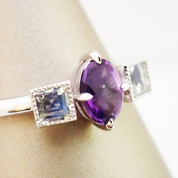 バフトップと呼ばれる、表面がカボションでお尻の部分にカットが施されているアメジストを、メインにした指輪です。時折光るロイヤルブルームーンストーンの青みが、アメジストの紫色とあいまって、指をすっきりとした印象に見せてくれます。