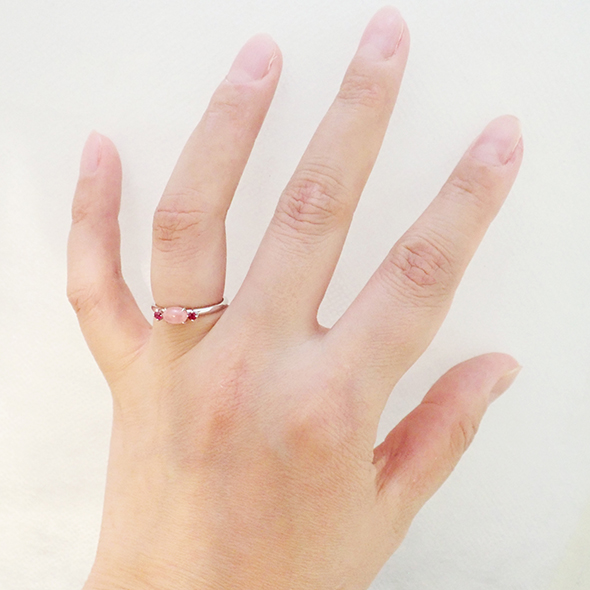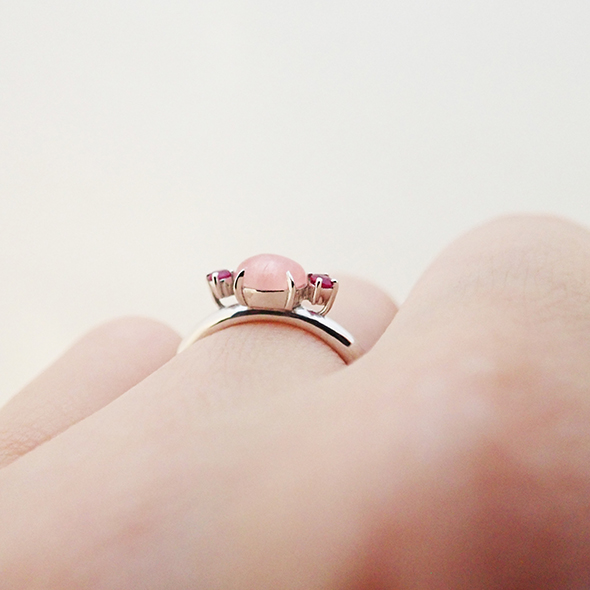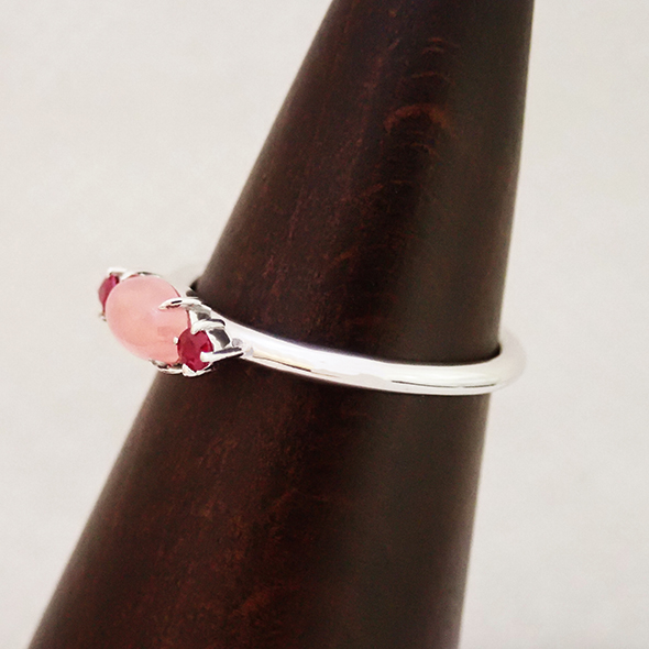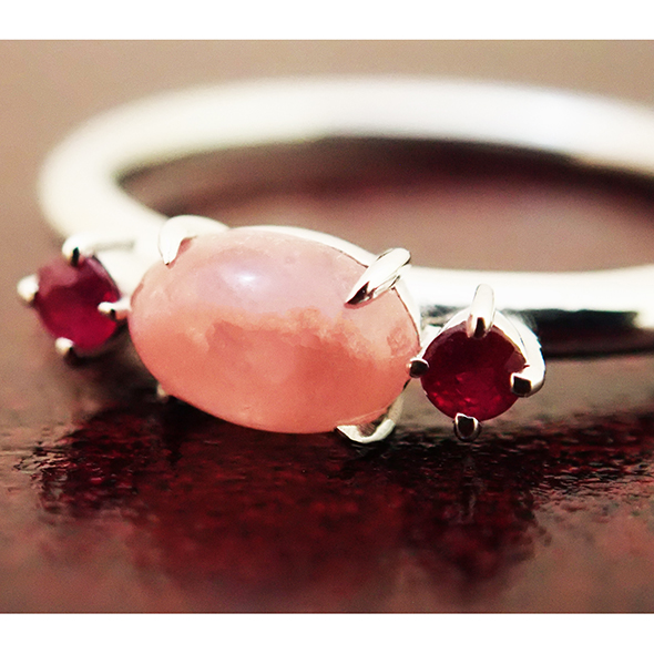 ロードクロサイトのカボションに、ルビーを合わせたリングです。内側から光るような優しい輝きのロードクロサイトと、はっきりとした輝きのルビーの対比が楽しいですね。