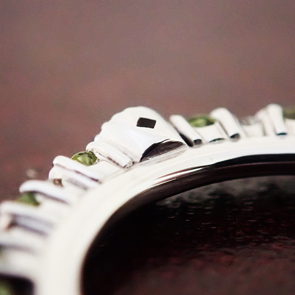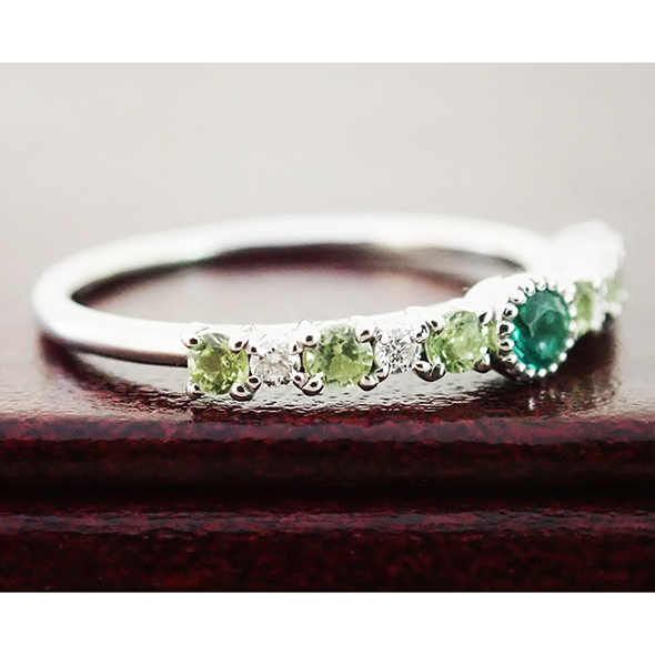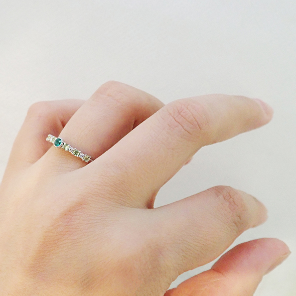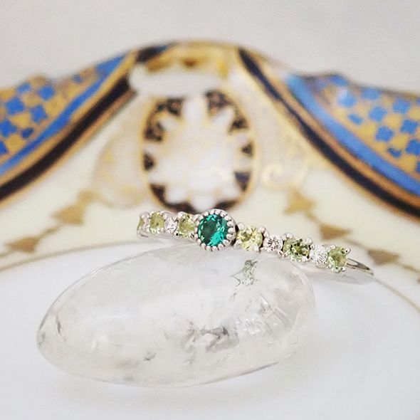 エメラルドを中心に、ダイヤモンドとペリドットを配置しました。小粒で上質な石達が、指を上品な雰囲気に導いてくれます。