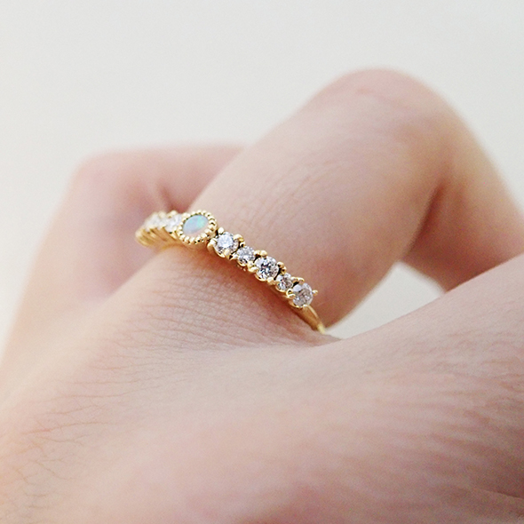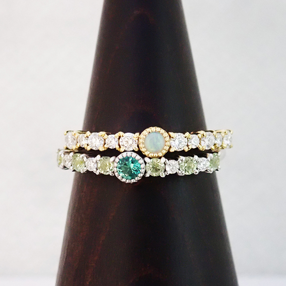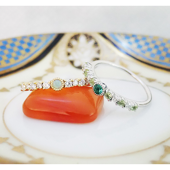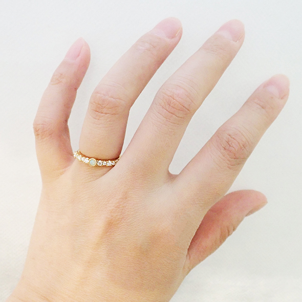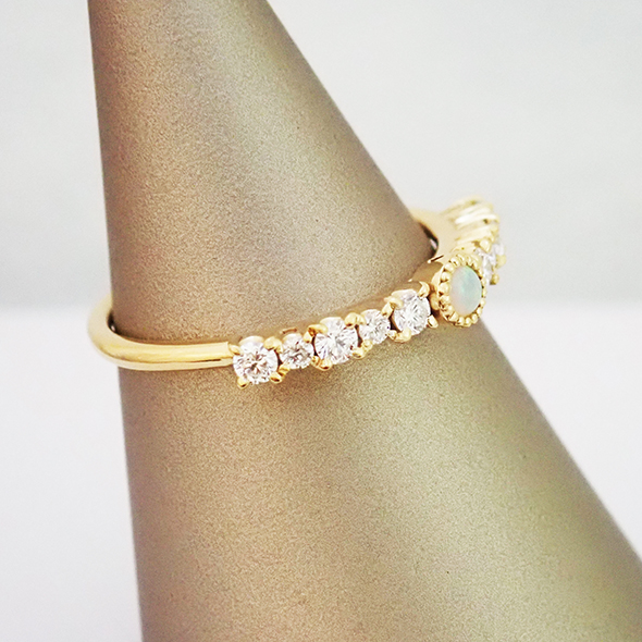 オパールにダイヤモンドを合わせたリングです。七色のオパールに、サイズの違うダイヤモンド達が輝きを添えてくれます。