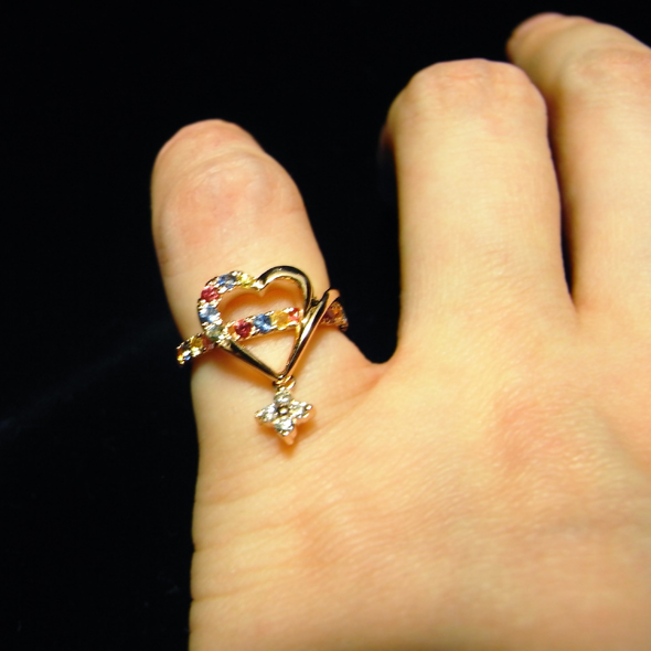 ハートの下を色とりどりのカラーサファイアが通っていて、立体的なデザインを楽しんで頂けます。