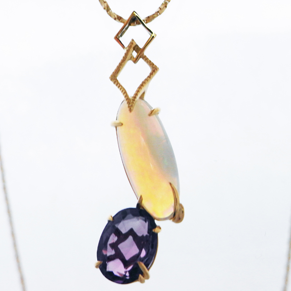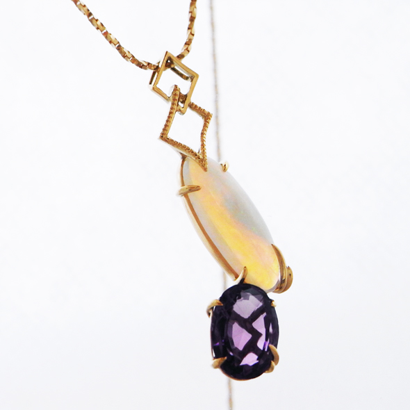 指輪だったアメジストとオパールを外して、ネックレスにリフォームしました。お手持ちのチェーンに合わせて、トップのデザインにボリュームをもたせました。