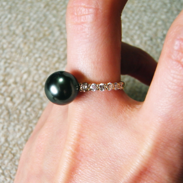 お客様の一番のご要望は「緑がかった南洋パールの指輪」でした。南洋パールを一番に引き立てたかったので、なるべくシンプルなデザインにしました。パールを指輪に埋め込む形にして爪を省き、ダイヤモンドの石座が、万が一の衝撃に耐えられるよう配置しています。