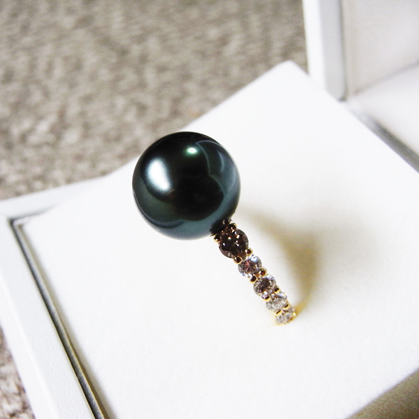 お客様から「緑がかった南洋パールの指輪が欲しい」とのオーダーをいただき、緑色の美しいパールを探すところから始めました。緑色と茶色は相性が良いので、パールの一番近いところにブラウンのダイヤモンドをあしらっています。