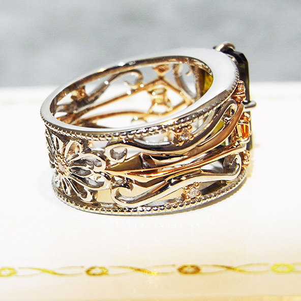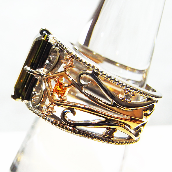 スフェーン独特の、緑色とオレンジ色の華やかな光を引き立たせるるために、ピンクゴールドを入れてコンビリングにし、さらにオレンジサファイアとダイヤモンドでアクセントをつけています。