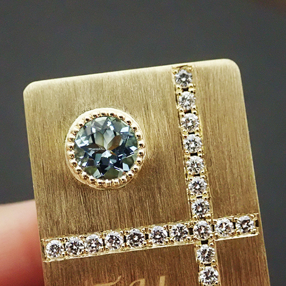 18金と、誕生石でもあるアクアマリンをこよなく愛するお客様です。1番の課題は18金でマネークリップを制作できるのかということでした。また、金で作る場合はできるだけ重さを減らさないと莫大な金額になってしまうので、今回は片方に蜂の巣型のくり抜きを沢山作ってみました。このオーダーをいただいた当初から納品するまで、ちゃんと完成するのかハラハラし通しでしたが、結果お客様にも大変喜んでいただき、心からホッとしています。