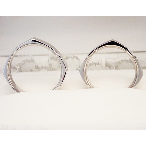 「平打ち」のリングがお好きだという事で、いくつもの平打ちリングをワックスで試作して、実際に指にはめていただきました。奥様の方の指輪には、四角の四隅にダイヤモンドが、旦那様には一角部分にだけダイヤモンドが五光留めで留めてあります。シンプルながら、とてもスタイリッシュなデザインになりました。