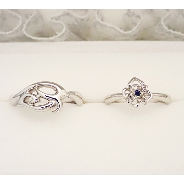 旦那様はトライバル柄がお好きで、奥様はお花がお好き。そして共通のご要望は「表(手の甲側)はシンプルな甲丸リングが良い」との事でした。