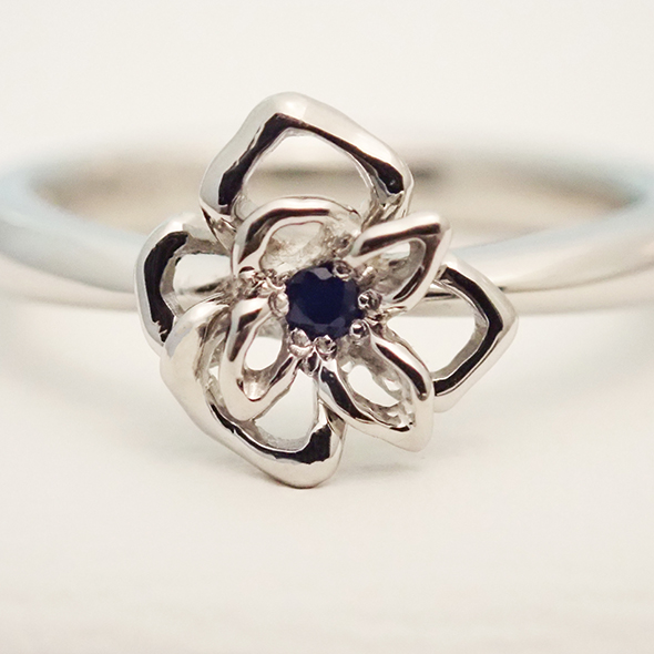 奥様の甲丸リング側にはダイヤモンドを一粒、お花側にはサファイアを留めています。