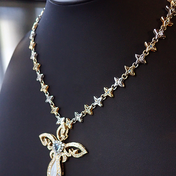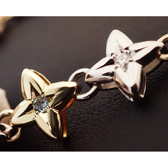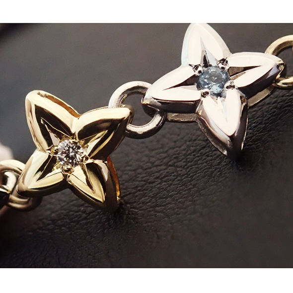 全てのパーツにダイヤモンドとアクアマリンを留めて、更にパーツを金とプラチナの交互でお作りしただけではなく、パーツ同士をつなぐ丸カンも金とプラチナの交互で制作しています。