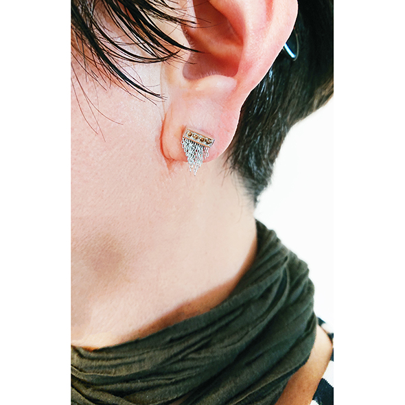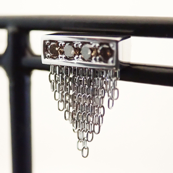 ブラウンダイヤモンドの色味で落ち着きを出した分、無数に垂れたチェーンには、パーツごとにカットが入ったカットチェーンを使用しています。
