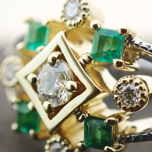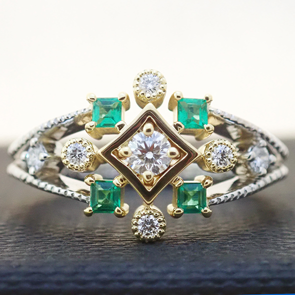 エメラルドとダイヤモンドのコンビエンゲージリング