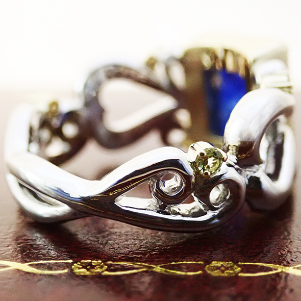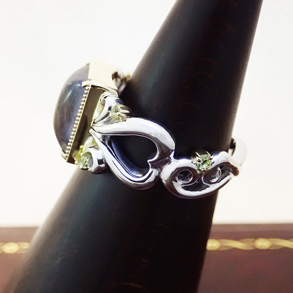 唐草やアンティークデザインがお好きだという事で、全体的に曲線の多いデザインに仕上げました。アクセントとして、指輪のところどころにペリドットを留めています。