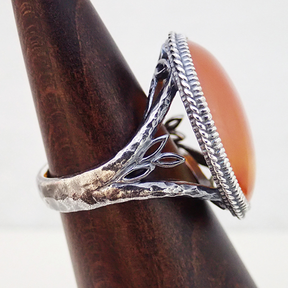 ペンダントは、シルバーの燻し仕上げで落ち着いた印象のトップだったので、指輪になってもその雰囲気を壊さないように、腕部分には槌目を入れて燻し仕上げにしました。